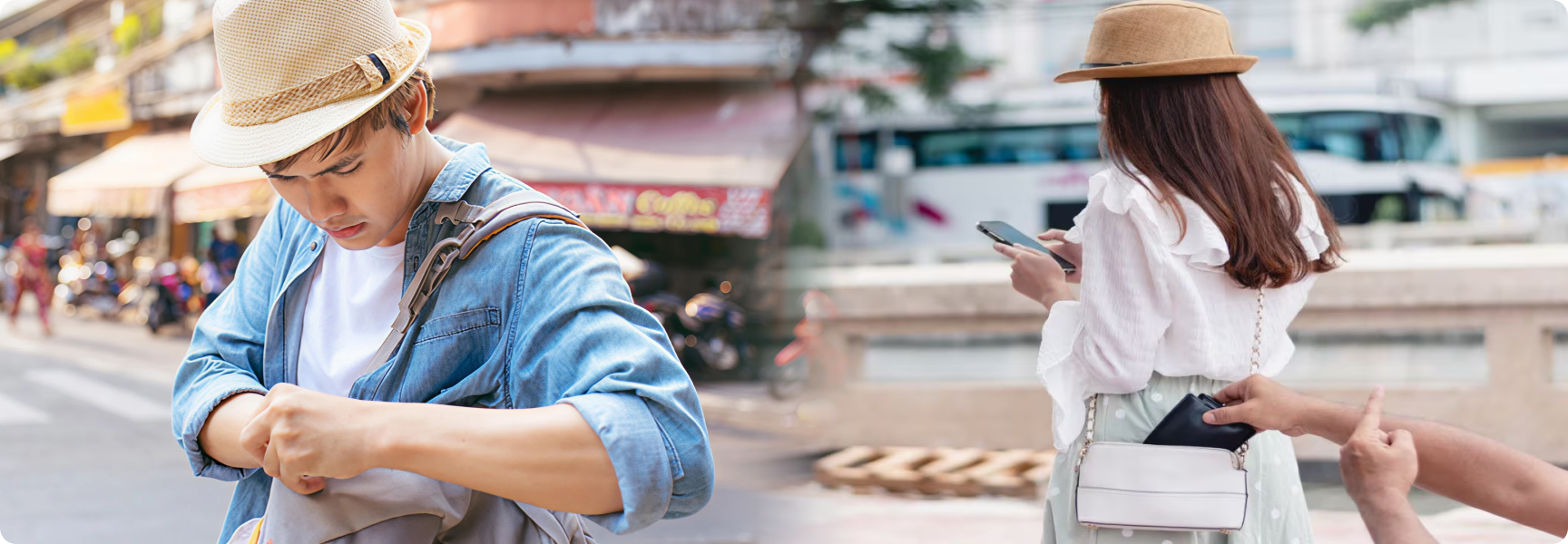 公共の場などの人の多いにぎやかな場所では、自分の身の回り品・かばんなどに異常がないか常に用心してください。特に財布、パスポート、スマートフォンなどの貴重品は後ろポケットに入れないでください。大事なものは前ポケットやジッパー付きのポケット、衣服の中に隠せるタイプのポーチなど、安全ですぐに確認できる場所に入れましょう。バックパックやショルダーバッグも、人込みでは身体の前方に掛けましょう。高価な時計やジュエリーなどもターゲットにされやすいため、安全な場所以外では着用を控えるか見えないように隠しましょう。お出かけの際は華美な服装を避け、持ち物も必要なものを最低限にしましょう。
