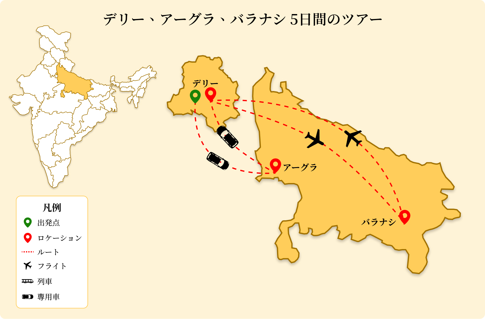 地名 :デリー・ジャイプール・アーグラ・バラナシ